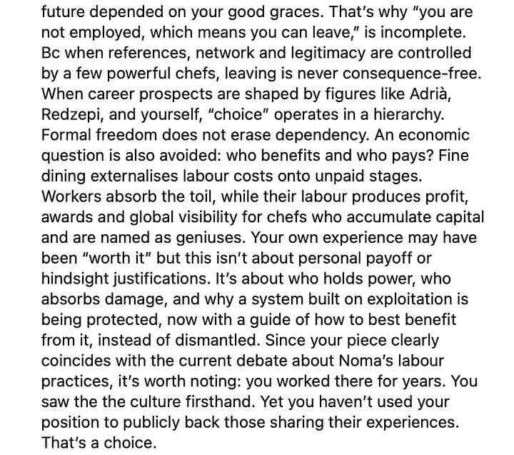 The weakness of your theories is that people like me, who have lived, suffered, endured, AND enjoyed the “system”, who have accepted to play by the rules of the game and come out well on the other side, must either be portrayed as villains or exploiters for your narrative not to fall into pieces. Because if the system is rigged, how else can you get to the top if not by exploitation? You have no choice but to dehumanize those who have been successful, because within your logic either people have no agency, are oblivious to the world they live in, or they must be truly bad people. It seems, according to your argument, that the restaurant industry, or maybe the world in general, consists not of complex humans, but only of sheep and wolves in constant power struggle. If I refuse to simplify life to that, a true Marxist will dismiss it as survivor bias: that I necessarily must be blind to the suffering of others, to have anything good to say about this work, this craft, and this industry.