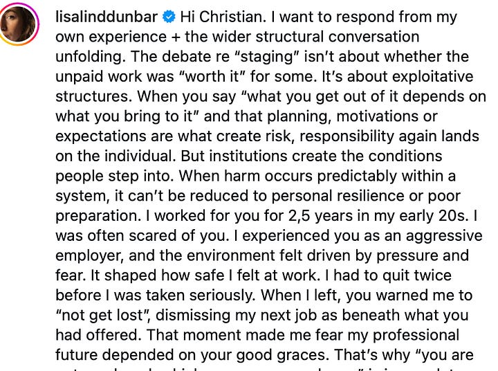 My last post on my experience working for free as a chef has, of course, met some criticism. Most notably, by the comment from my former employee, Lisa Dunbar.